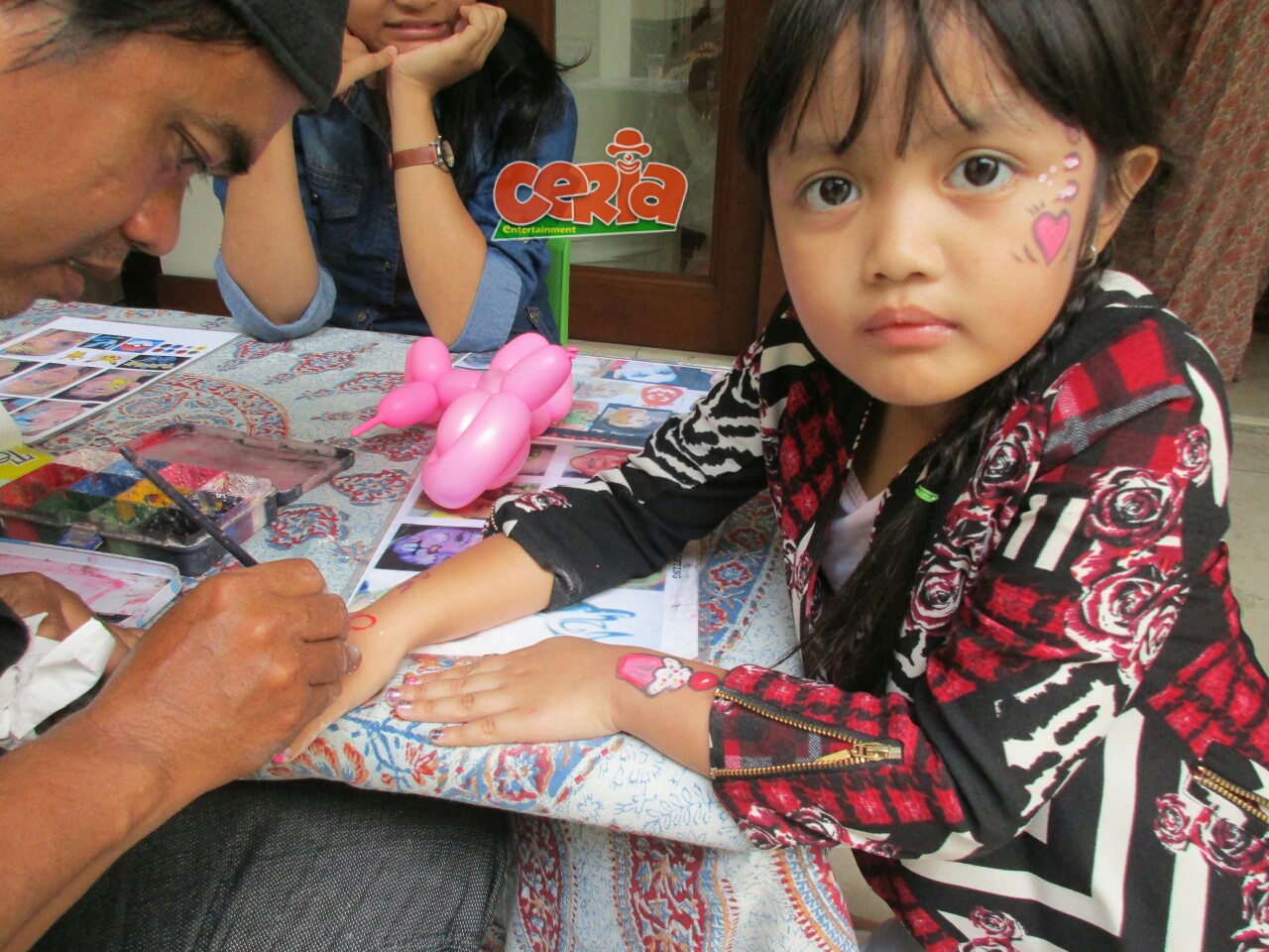 Dengan lukisan pada wajah atau tangan, acara ulang tahun anak anda menjadi lebih seru karena setiap anak akan kami lukis wajahnya atau tangannya sesuai dengan keinginan. Anak-anak akan semakin percaya diri dengan wajah yang telah kami lukis.